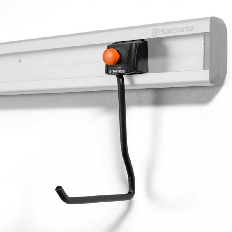 Гак для зручного зберігання ваших інструментів. Компактний дизайн, його легко закріпити на стіні або повісити на рейки. Підходить для всіх виробів Husqvarna з замковою щілиною та сумісний із наявною системою зберігання Husqvarna.